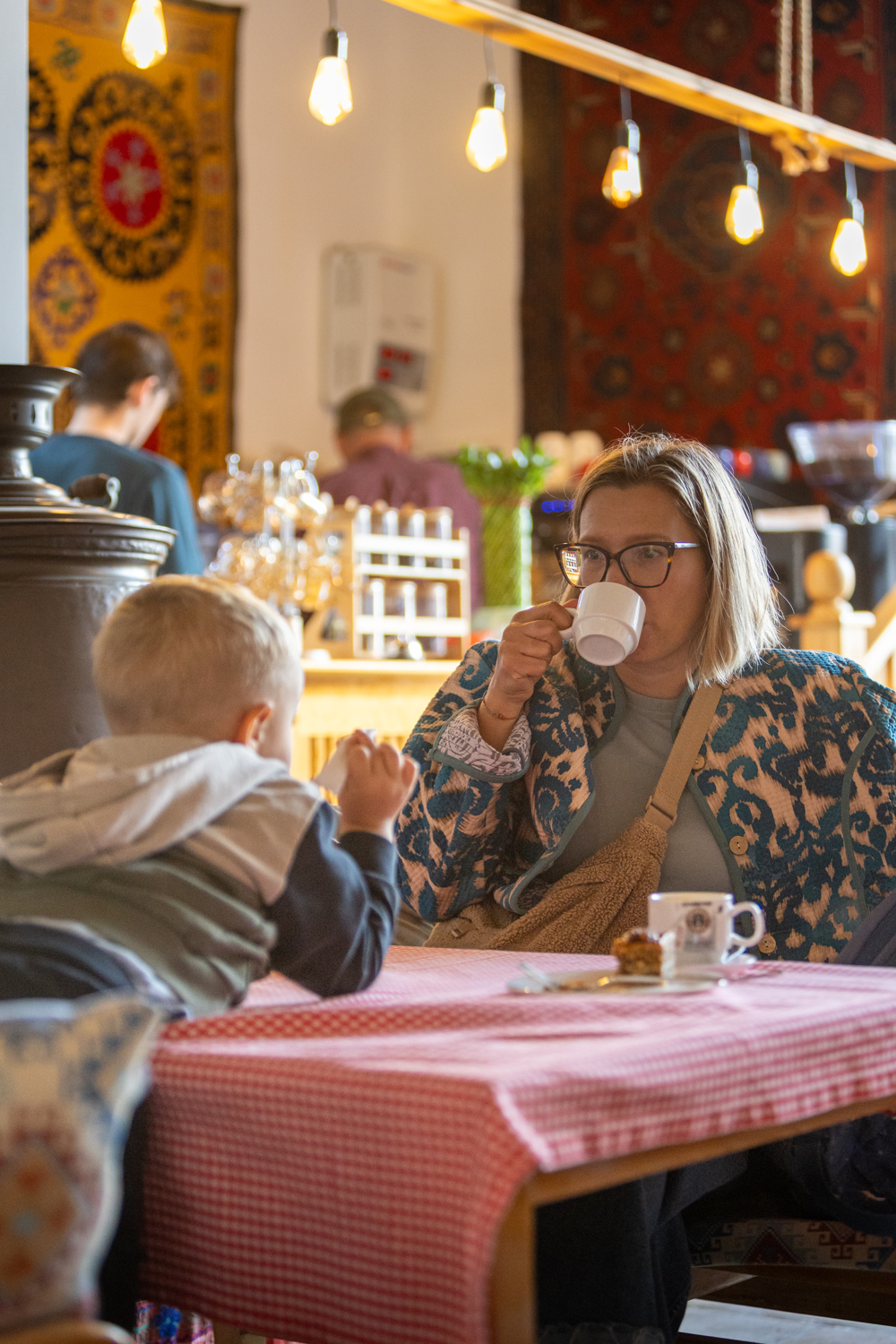 Danes, ko je Lila spet prišla na svojih 100 %, smo si privoščili tudi najdražje in najboljše kosilo v Uzbekistanu do sedaj. Odločili smo se za restavracvijo v strogem centru mesta, z razgledom na visoka obzidja, modrikaste ploščice in živahno ulico. Naročili smo solatke, pa krompirček, pečena jagnječja rebrca, šiš kebabe, pečenega piščančka, sveže pečen kruh, tri domače omake … pa dvakrat deci uzbekistanskega merlota. In plačali 41 eur.